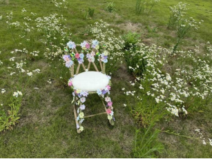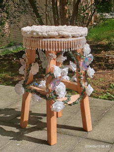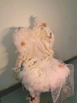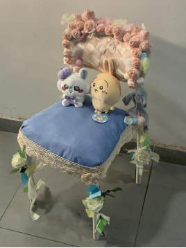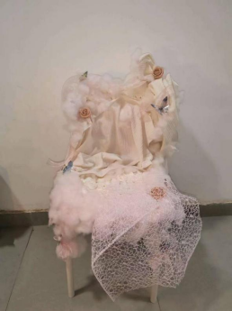 这一把椅子采用了纸巾、棉花、丝带、玫瑰等材料,灵感来源于玫瑰花束,椅子边缘采用了蕾丝边元素,增添了几分精致,选用了柔软的棉花材料,确保了坐感舒适,椅面采用了丝带菱格编织,内填充棉花使椅子更加柔软,辅以纸玫瑰,彩棉的层叠效果进行装饰。凳腿采用纸蝴蝶,玫瑰进行装饰,增添色彩美。