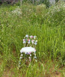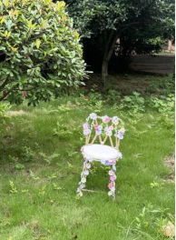 装饰细节:椅子的两侧和背部装饰着大量的彩色花朵,这些花朵采用纸制或塑料材质,保证了其轻便且易于清洁。此外,椅子顶部悬挂的绿色小球和黄色圆球增加了椅子的趣味性,使得整个设计更加生动。