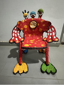怪兽椅子的外观独特而引人注目。整体色调以红色、黄色和绿色为主,模仿了鱼模型上的斑斓色彩。椅背部分采用了夸张的眼睛设计,三个眼睛的的装饰分别采用红色、黄色和绿色,既体现了怪兽的趣味性,又增强了椅子的视觉冲击力。