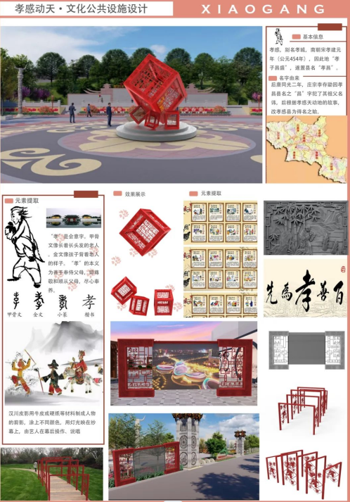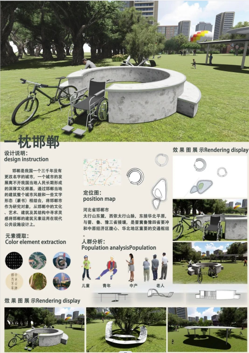 设计说明:邯郸是我国一个三千年没有更改名字的城市,一个城市的发展离不开我国当地人民长期形成的深厚文化根基,通过邯郸当地的建筑整个城市风貌和一些文字形态(篆书)相结合,将邯郸市作为研究对象,从邯郸中的文化艺术、建筑及其结构中寻求灵感将邯郸的建筑元素运用在现代公共设施设计上。