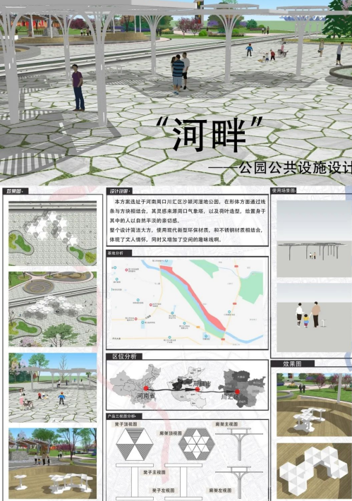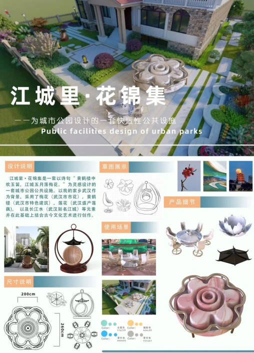 设计说明:江城里·花锦集是一套以诗句“黄鹤楼中吹玉笛,江城五月落梅花。”为灵感设计的一套城市公园公共设施。以我的家乡武汉作为背景,采用了梅花(武汉市市花),黄鹤楼(武汉市特色建筑),莲花(武汉盛产莲藕),以及长江水(武汉别名江城)等元素并在此基础上结合古今文化艺术进行创作。
