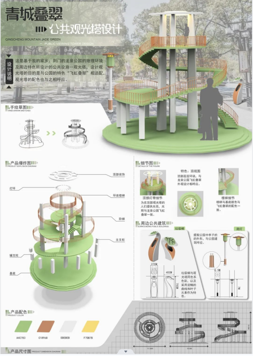 设计说明:这是基于我的家乡—荆门的龙泉公园的地理环境及周边特色所设计的公共设施一观光塔,设计观光塔的目的是与公园的特色“飞虹叠翠”相适配,观光塔的配色也与之相呼应。