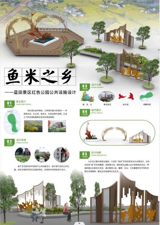 设计说明:以红色之路为旅游主轴线,六边形“稻米”形态的观光台为主要设计,台中央设有“鱼”形态的雕塑,底部是水池,通向观光台路上设计有围坐的花坛,两遍则是红色革命文化栏,通过景观小品、雕塑、花坛、文化雕塑栏等不同形态展示洪湖精神、建设生态家园等红色文化。