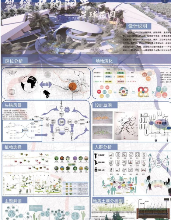 设计说明:通过对星球花园的头脑风暴,前期调研,案例分析。从大地裂痕为切入点,探索地下景观,根据地质变化的影响。营造个满足于观赏,休闲、互动体验为主的星球主题花园。花园以星球轨道为景观轴线,根据地壳运动形成不同坡地,高差依次安置树篱漫步—声音隧道—星球气泡—水幕墙等四个主要的游览体验区。