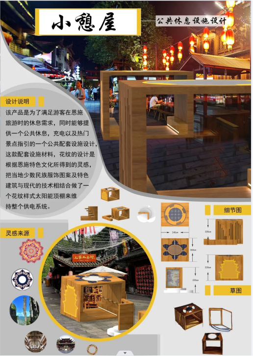 设计说明:该产品是为了满足游客在恩施旅游时的休息需求,同时能够提供一个公共休息,充电以及热门景点指引的一个公共配套设施设计,这款配套设施材料,花纹的设计是根据恩施特色文化所得到的灵感,把当地少数民族服饰图案及特色建筑与现代的技术相结合做了一个花纹样式太阳能顶棚来维持整个供电系统。