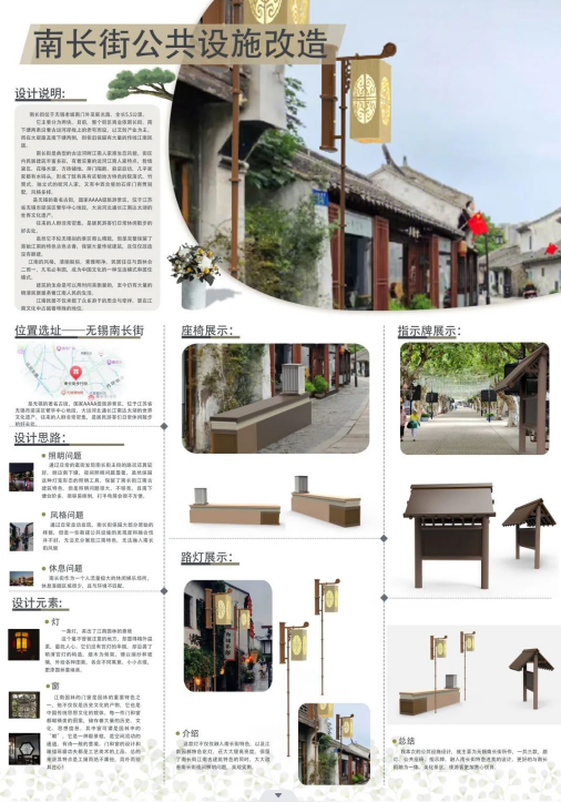 设计说明:南长街位于无锡老城南门外至新光路,全长5.5公 里。它主要分为两块,目前,整个街区商业依南长街、南下塘两条沿着古运河岸线上的老宅而设,以文创产业为主。而在大窑路及南下塘两侧,则依旧保留有大量的传统江南民居。南长街是典型的古运河畔江南人家原生态风貌。民居往往与园林合二而一,凡宅必有园,成为中国文化的一种生活模式和居住模式。建筑的生命是可以用时间来衡量的,至今仍有大量的明清民居服务着江南人民的生活。江南民居不仅承载了众多游子的思念与牵绊,更在江南文化中占据着特殊的地位。