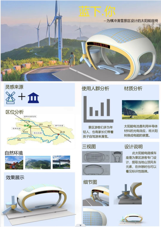 设计说明:此太阳能电路候车座是为景区游客专门设计,提取当地山顶风车元素,在休憩时也可以看见标识性路牌。