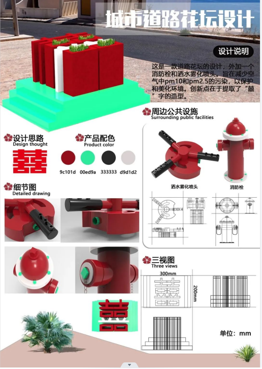 设计说明:这是一款道路花坛的设计,外加消防栓和洒水雾化喷头。旨在减少气中pm10和pm2.5的污染,以保护和美化环境。创新点在于提取了“喜”字的造型。