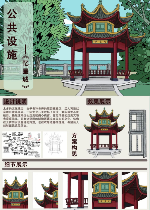 设计说明:太多的文化瑰宝,由于各种各样的原因被毁灭,后人再难以亲眼目睹其风采。一场大火几乎毁坏了长沙,繁华盛世不复往日,提起这段伤心历史就痛心疾首,弥足珍贵的历史文物也寥寥无几,只有这坚固的城墙还矗立在天心阁之中,仿佛在无声的诉说曾经的辉煌,也在叹息遗憾的遭遇,希望后人能够谨记这段历史。