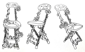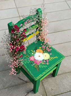 作品的名为《倚椅生花》。此椅大体以绿色为主色调,横靠背上香水百合和柠檬黄为辅调,靠背边用永生花做装饰,与凳面用水粉绘出鲜花图案相辅相衬。主体绿色犹如绿叶,衬托着永生花,让永生花变得生动逼真、栩栩如生像真正的鲜花一般怒放着自己鲜活的生命力。