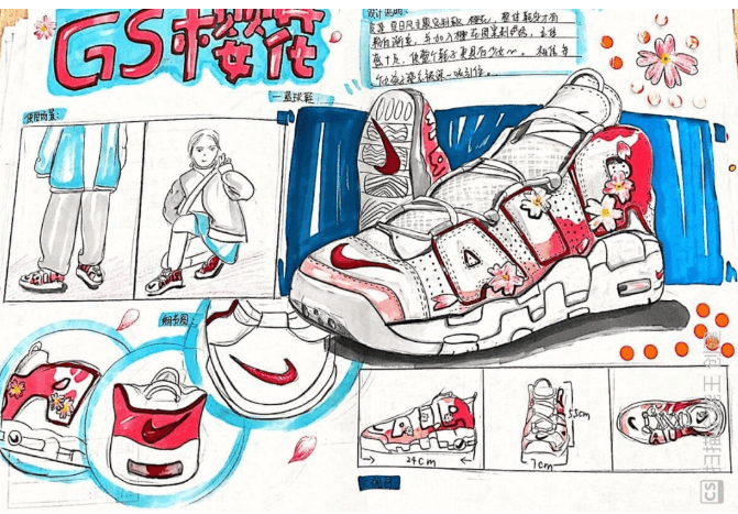 运动鞋的线条特点是:线条复杂,形式多样。有单线、双线、假线、明线、虚线、轮廓线、棱线、接缝线、装饰线等,可同时运用在一双鞋上,不拘泥于一种。多以弧线为主,直线比例较少。运动鞋在装饰上,图案、文字、标识、金属和塑料部件等都可作为装饰材料;装饰部位比较自由;装饰效果较醒目;装饰多以动感、时尚、色彩鲜艳为特征;装饰部件朝着美观与功能相结合的方向发展。