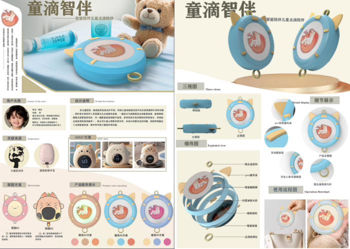 许书榕、范菲和卫钏同学设计的《童滴智伴》以猫咪为原型,专为儿童医院的点滴场景设计。其近似圆形的扁平状结构,方便儿童使用和吸附。顶部的铝合金环扣设计,让产品可以牢固地挂在点滴杆上。这款设计不仅体现了学生们对儿童需求的细致关怀,更展现了他们在儿童医疗辅助产品设计中的创新能力和对用户体验的深刻理解。