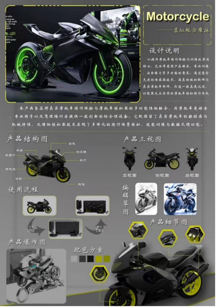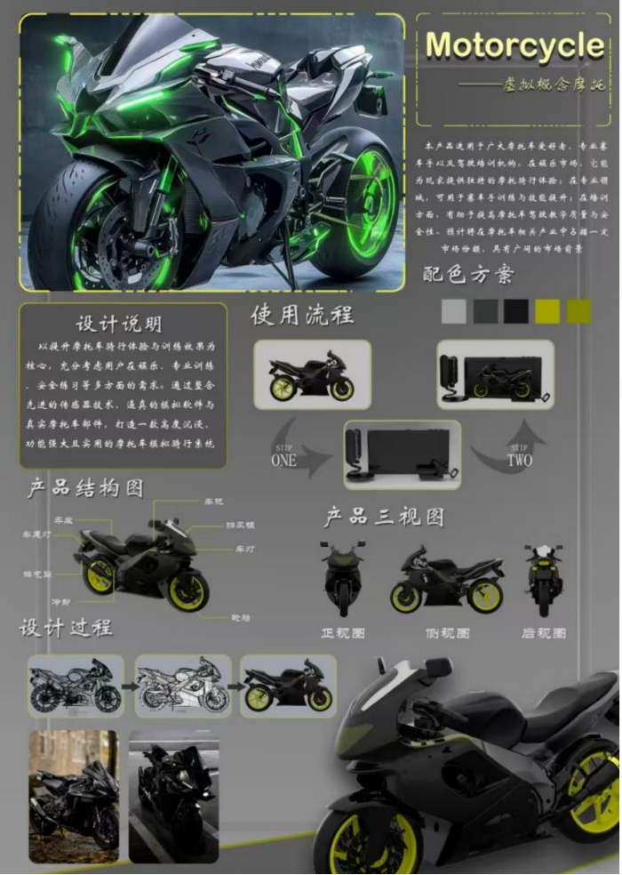 王一诺和曹明宇同学设计的《虚拟概念模特》,将真实摩托车骑行体验与摩托车模拟器的多功能性完美融合。这款创新设备不仅保留了真实摩托车的操控感与机械特性,还通过模拟器技术实现了多样化的骑行场景模拟、技能训练与数据反馈功能。它为摩托车爱好者、专业骑手以及驾驶培训者提供了一种全新的体验方式,展现了学生们在跨领域设计中的卓越能力。