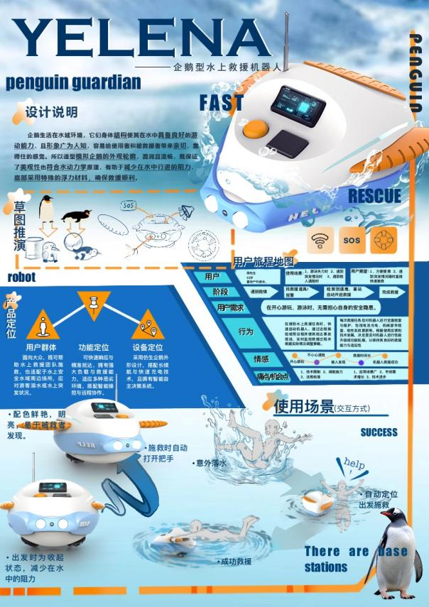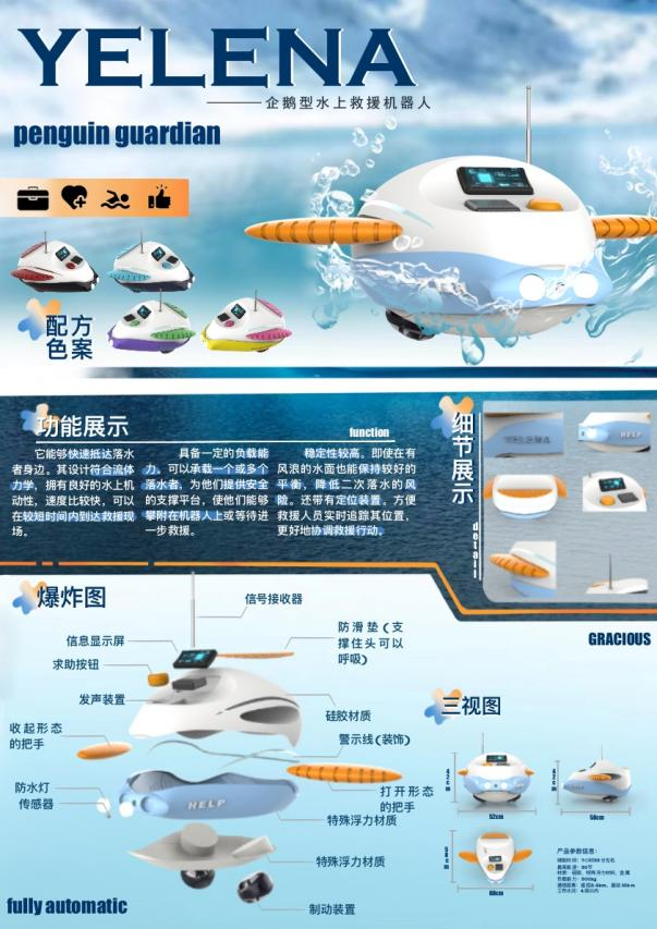 尹雨馨和周正康同学从企鹅的水中游动能力中汲取灵感,设计出这款《YELENA企鹅型水上救援机器人》。其造型圆润流畅,不仅美观,还符合水动力学原理,能有效减少水中行进阻力。底部的特殊浮力材料确保了救援的顺利进行。这款设计不仅展现了学生们对自然生物的巧妙模仿,更体现了他们在应急救援领域的创新思维,为水上救援提供了新的思路和解决方案。