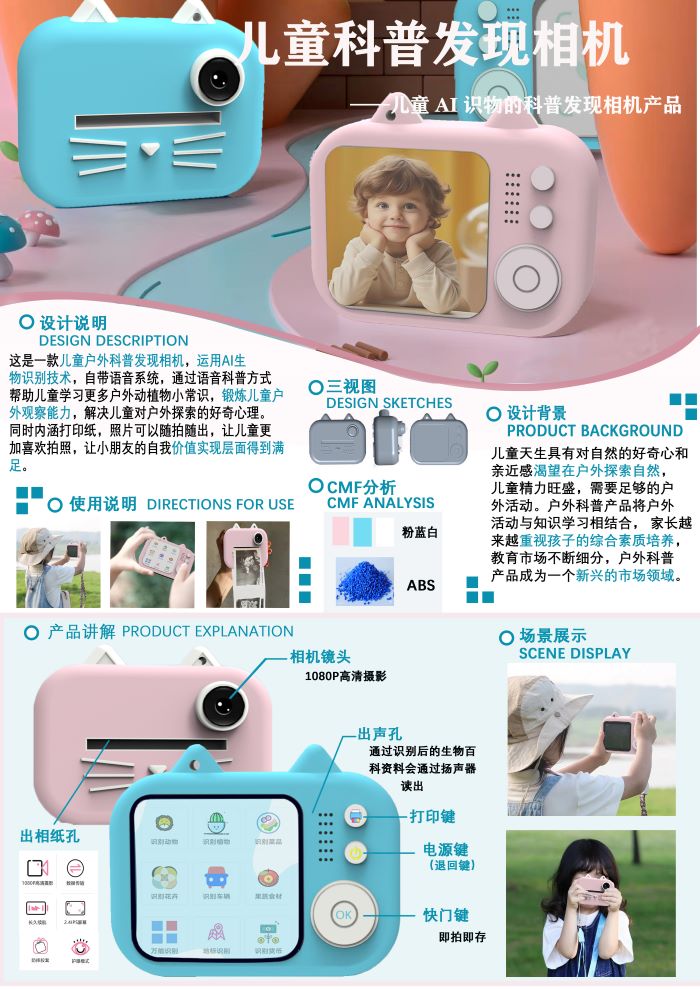徐美林同学的《儿童 AI 识物科普发现相机》,运用 AI 生物识别技术,自带语音系统,通过语音科普方式帮助儿童学习更多户外动植物小常识,锻炼儿童的户外观察能力。同时,相机内涵打印纸,照片可以随拍随出,满足了儿童对户外探索的好奇心理,让小朋友在实践中实现自我价值。这一设计不仅体现了学生们对儿童教育的重视,还展示了他们在科技应用和产品功能创新方面的出色能力。