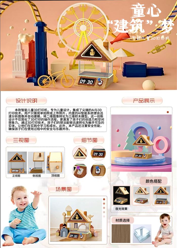 岳红栗同学设计的《童心建筑梦-智能儿童 3D 打印机》,集成了尖端的 AI 与 3D 打印技术。用户只需简单拍照或上传照片,内置的 AI 智能系统便会迅速分析图像并自动建模,将二维图像转化为三维积木模型。这一创新设计不仅简化了 3D 打印的操作流程,还激发了孩子们的创造力和空间想象力,同时注重安全性能,确保孩子们在使用过程中的安全与乐趣并存。这一作品充分展现了学生们在儿童教育产品设计中的创新思维和对科技应用的深刻理解。