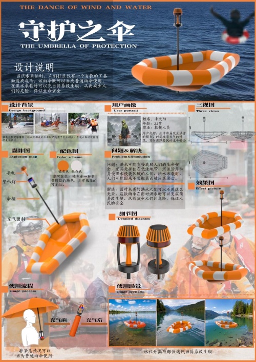 面对洪水等自然灾害的威胁,李成博、张宏杰和葛炎臻同学设计的《守护之伞》应运而生。这款伞在日常可作为普通雨伞使用,但在洪水来袭时,它能迅速转变为简易救生艇,为人们提供紧急自救工具。这一设计不仅展现了学生们对公共安全问题的关注,更体现了他们在应急设计领域的创新能力和对生命安全的高度重视。