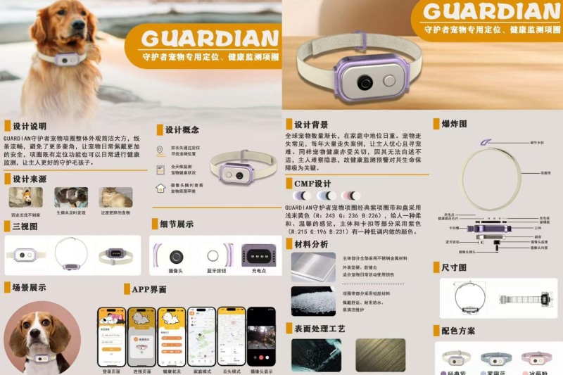 王蒙和程梦琪同学设计的《GUARDIAN守护者宠物项圈》,以其简洁大方的外观和实用功能脱颖而出。项圈线条流畅,避免了尖锐菱角,确保宠物佩戴的安全性。同时,它还具备定位和健康监测功能,让宠物主人能够更好地守护自己的毛孩子。这款设计不仅体现了学生们对宠物市场的敏锐洞察,更彰显了他们在产品功能性和用户体验上的精心打磨。