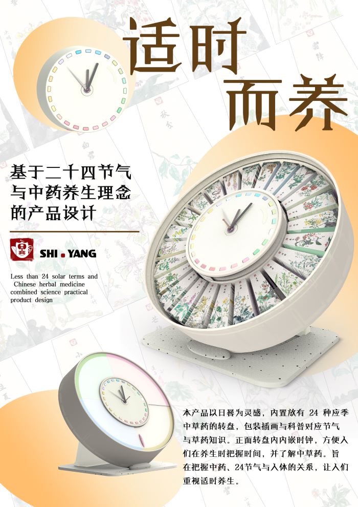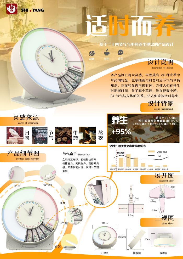吴晓、徐新华和顾雯倩同学设计的《适时而养》是一款以二十四节气为主题的养生产品。该产品以日晷为灵感,内置24种应季中草药的转盘,包装插画与科普内容对应节气与草药知识。正面转盘内嵌时钟,方便用户在养生时把握时间,了解中草药的使用方法。产品旨在把握中药、二十四节气与人体的关系,让人们重视适时养生。展板设计采用橙色调,突出产品的活力与现代感。这一设计展现了学生们对传统文化与现代设计融合的探索,以及在养生产品设计中的创新理念。