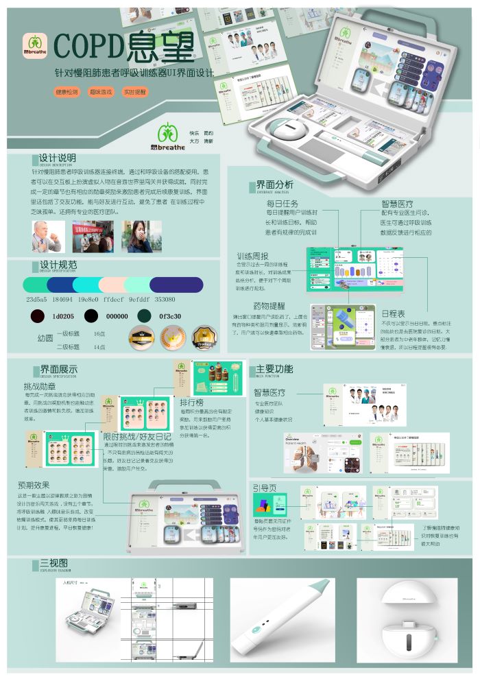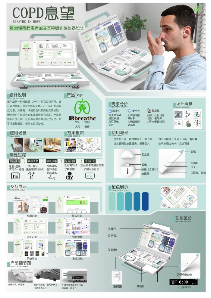张云飞、刘兵和罗宇同学设计的《COPD息望》是一款针对慢阻肺(COPD)患者的交互式呼吸训练仪。该产品通过游戏化的方式进行呼吸训练,结合互动游戏元素,如任务、成就系统以及实时反馈机制,帮助用户在游戏中训练呼吸频率和深度。此外,产品还包含社交元素,让患者可以与其他用户互动、分享成绩和进度,提升社交互动性。这一设计体现了学生们对医疗康复领域的关注,以及在交互式医疗产品设计中的创新思维。