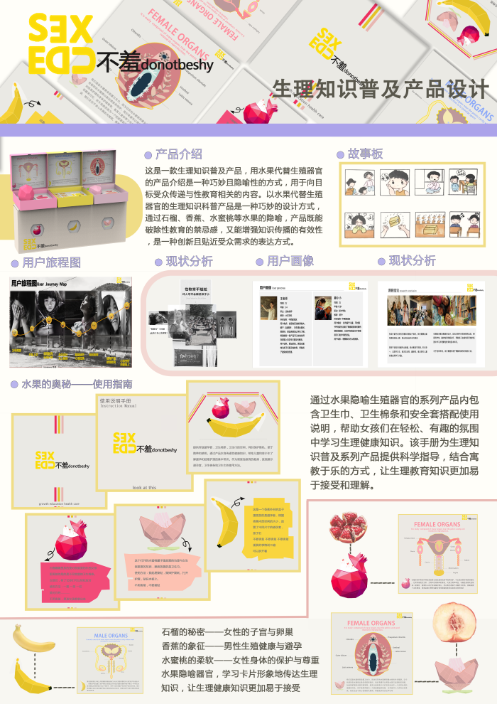 孙嘉奕、梁彩云和韩嘉遥同学设计的《不羞》是一款面向10-15岁留守女孩的生理知识科普产品。该产品以生动、易懂且私密的方式普及生理知识,通过水果外形象征人体器官,辅以说明手册讲解月经初潮、生育变化、卫生用品使用等内容。这一设计旨在帮助女孩更好地了解自己的身体变化、生理健康与心理成长,建立健康的自我认知,同时打破社会对生理知识普及方式的刻板印象,让学习生理知识成为自然的学习体验。这一设计展现了学生们对青少年教育的深刻理解,以及在科普产品设计中的创新思维。