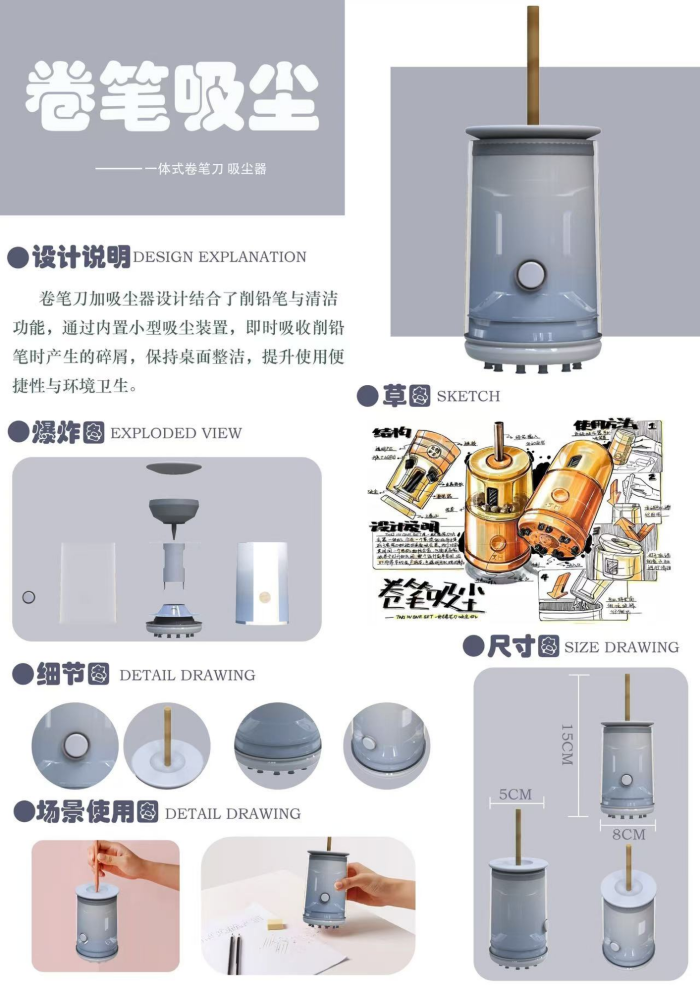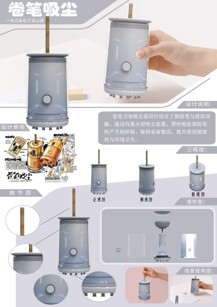 赵卜司和刘欣雨同学设计的《一体式卷笔吸尘器》,将卷笔刀与吸尘器的功能巧妙结合。通过内置小型吸尘装置,它能够即时吸收削铅笔时产生的碎屑,保持桌面整洁,提升使用便捷性与环境卫生。这一设计不仅解决了日常使用中的痛点,还体现了学生们在功能优化和用户体验提升上的创新思维。