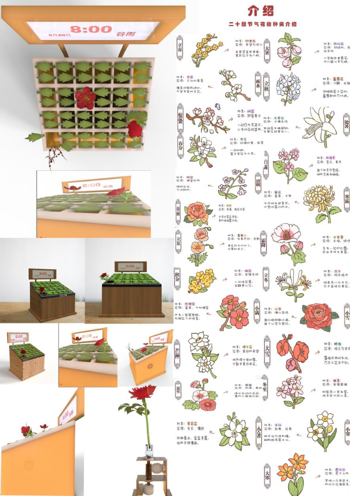 陈嘉杰、刘庆祖和李子璟同学从传统文化中汲取灵感,设计了这款《24节气时钟》。它参考地鼠机的外形,采用24宫格设计,每个宫格对应一个节气,并配有相应的花朵。在节气到来时,花朵会升起并散发香味,同时播报与节气相关的诗句。这一设计不仅展现了学生们对传统文化的深刻理解,更体现了他们在现代设计中融入文化元素的创新能力。