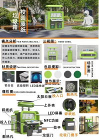 面对校园废纸回收率低、分类不明确及资源浪费等问题,我们定义了提升回收效率和准确性的设计挑战。采用案头调查、观察法和访谈法进行研究,发现校园缺少专门的废纸回收设施,师生环保意识薄弱,环卫人员工作负担重。调研结果显示,需要一种既能自动分类压缩废纸,又能激励师生参与回收的智能设备。我们设计了一款集智能、高效、环保于一体的废纸回收箱。该产品采用铝合金与高级塑料材质,配备LED柔性屏和太阳能板,实现自供电与信息展示。通过NFC功能,用户可实现无接触开盖,简化投放流程。内置碎纸机自动搅碎并压缩废纸,减轻环卫人员工作量,提高回收效率。散热孔设计确保设备稳定运行,垃圾门提手则方便清理与维护。