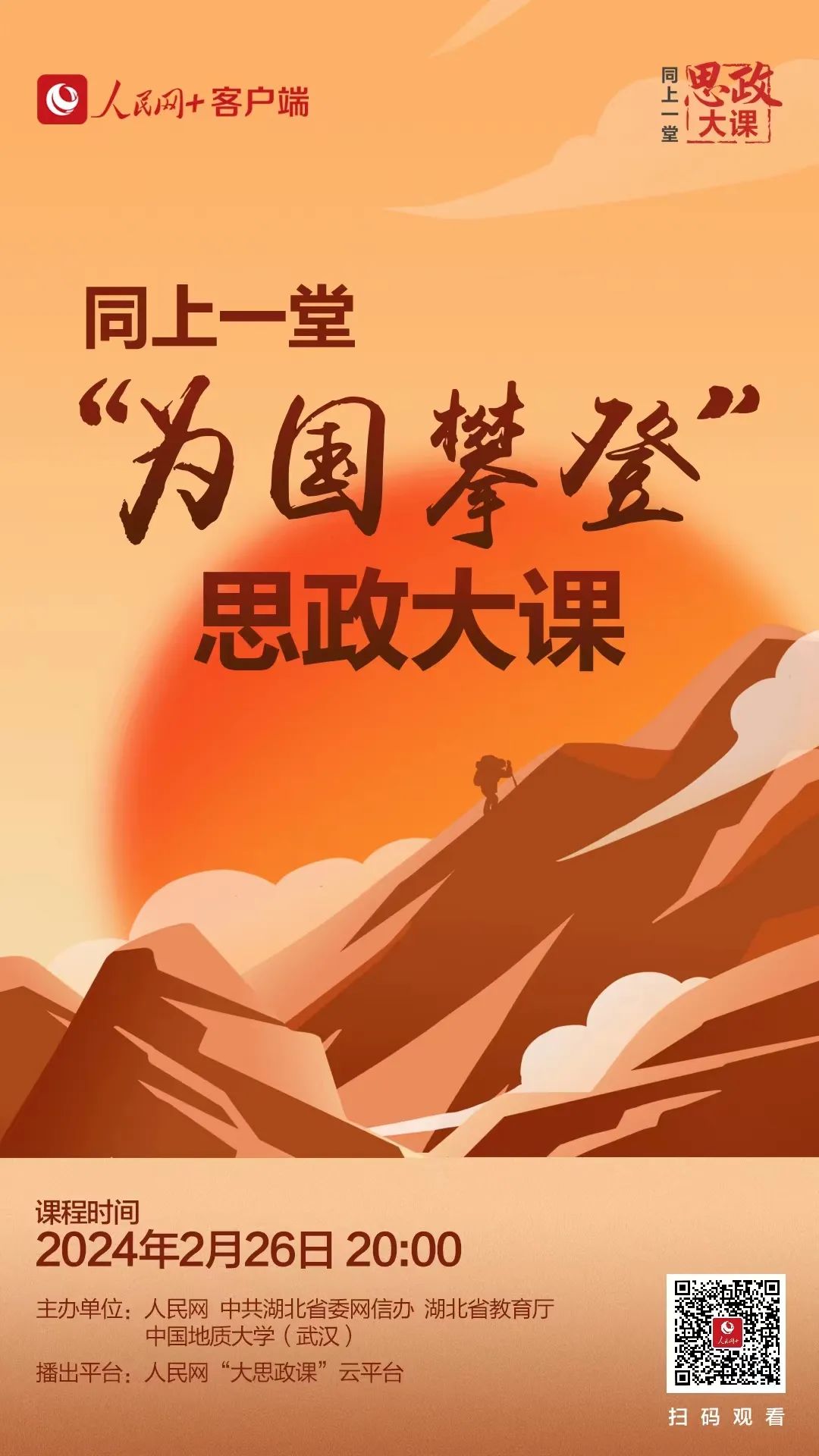 第一,组织观看“同上一堂‘为国攀登’思政大课” 。2024年2月26日20:00,由人民网、中共湖北省委网信办、湖北省教育厅和中国地质大学(武汉)共同主办的“同上一堂‘为国攀登’思政大课”在人民网“大思政课”云平台准时开讲,请各位辅导员老师组织学生在线上进行观看,领悟“扎根中国、胸怀天下、勇攀高峰、追求卓越”的攀登精神。