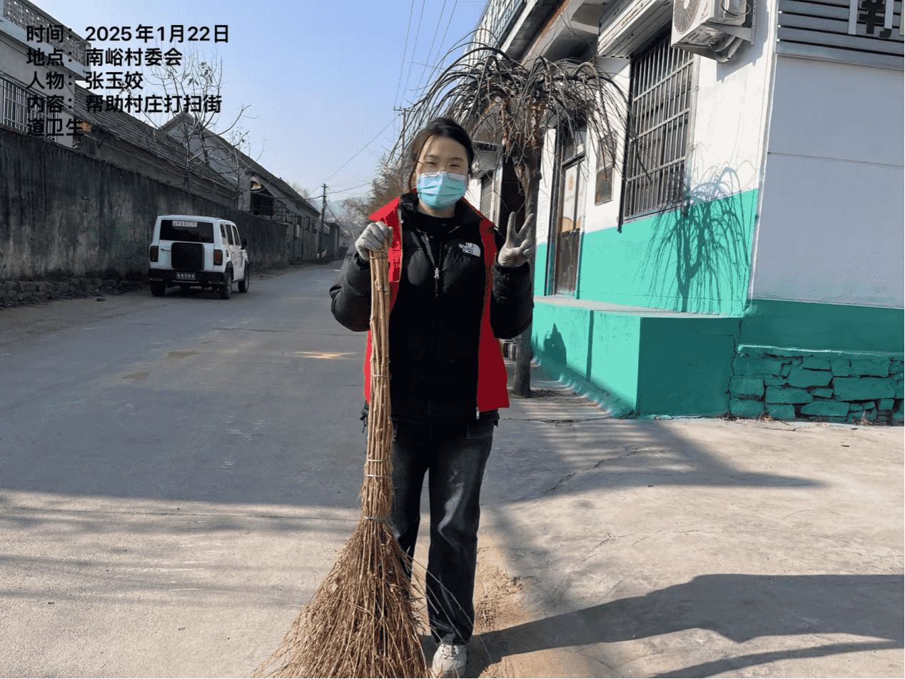 张玉姣同志于2025年1月22日至2025年 1月23日开展了南峪村委会的街道卫生清扫活动和南峪村卫生院的健康知识宣传活动。本次活动共同助力国家卫生与健康事业,促进社会和谐发展。