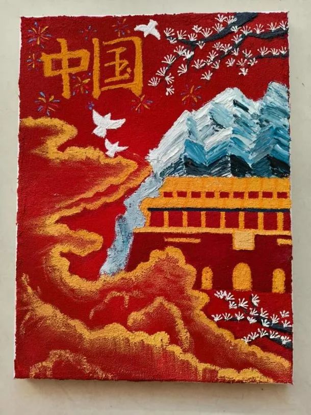 设计说明:这幅画以红色为主色调,画面中绘有天安门、山脉连绵起伏,体现了祖国的大好河山与繁荣昌盛;白色飞鸟增添了灵动之感,松树象征不屈服于困境。“中国”二字醒目地出现在画面中,整体通过色彩与元素的搭配,表达了浓厚的爱国情怀和对祖国壮丽景色的歌颂。