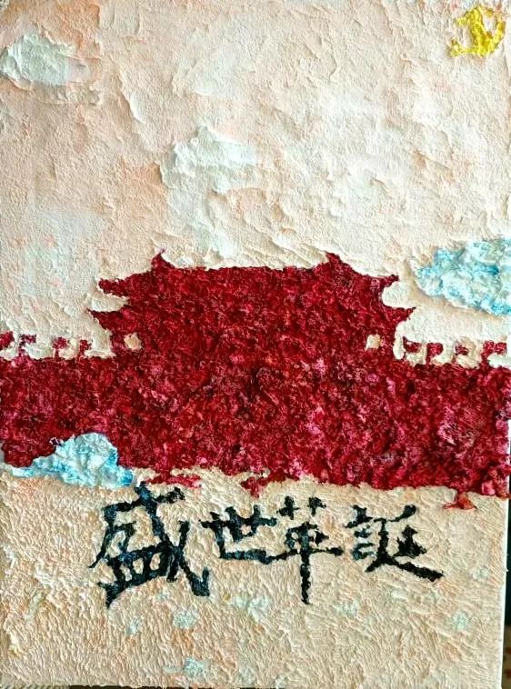 设计说明:本幅纸浆画以中间红色城墙为主题,城墙与周围的淡黄色渐变背景形成强烈对比,同时巧妙融合了传统与现代的艺术元素,呈现出一幅既庄重又富有韵味的作品。