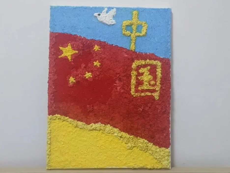 设计说明:本次纸浆画创作是以纸浆为主要材料,围绕爱国主题进行创作的工艺美术作品,表达对祖国的热爱、赞美与敬意。