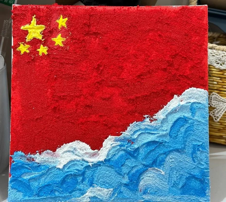 设计说明:此幅作品将大海与祖国国旗结合,呈现祖国大好河山,乘风破浪的壮丽前景。