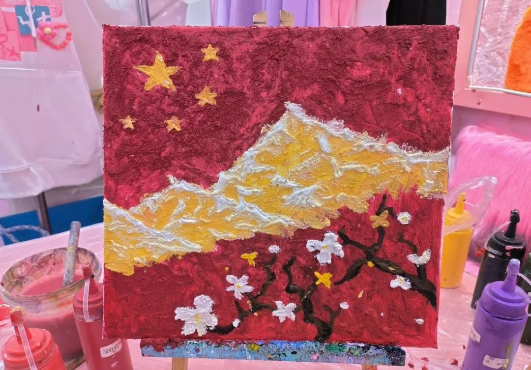 设计说明:这幅作品以中国元素为主题,背景采用鲜艳的红色,营造出庄重而热烈的氛围,五星红旗,寓意着国家的荣耀与希望。金色的山峦起伏,肌理质感凸显山脉的厚重与磅礴。白色和黄色的花朵绽放于山间,表达了对祖国的热爱与赞美,以及对美好生活的向往。