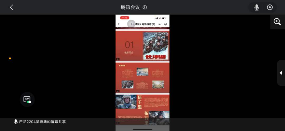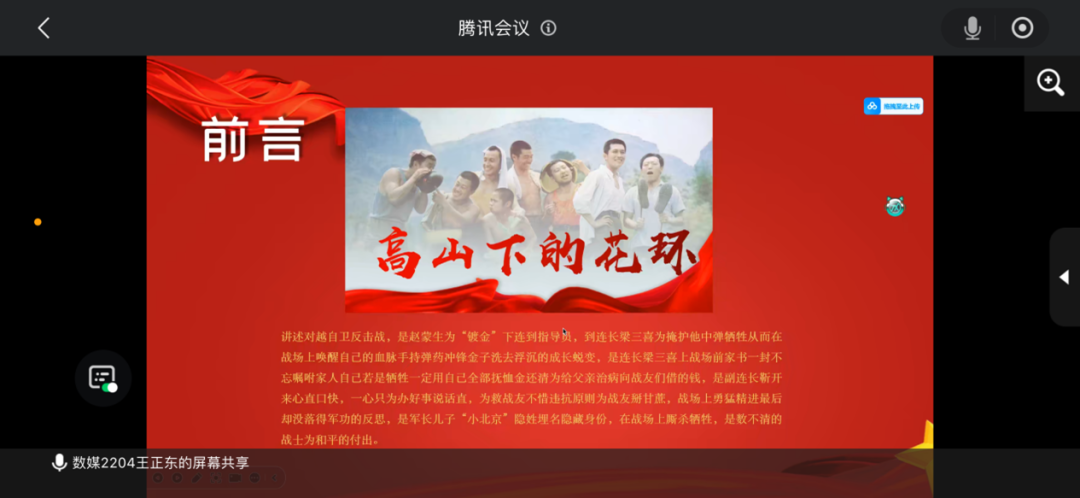 吴典典同志给大家带来的影片《长津湖》。此部影片让我们不能忘记那段历史,不能忘记那些为了国家和人民付出生命的英雄们。他们的精神,是我们中华民族宝贵的财富,激励着我们在新时代的征程中,不畏艰难,奋勇前行。