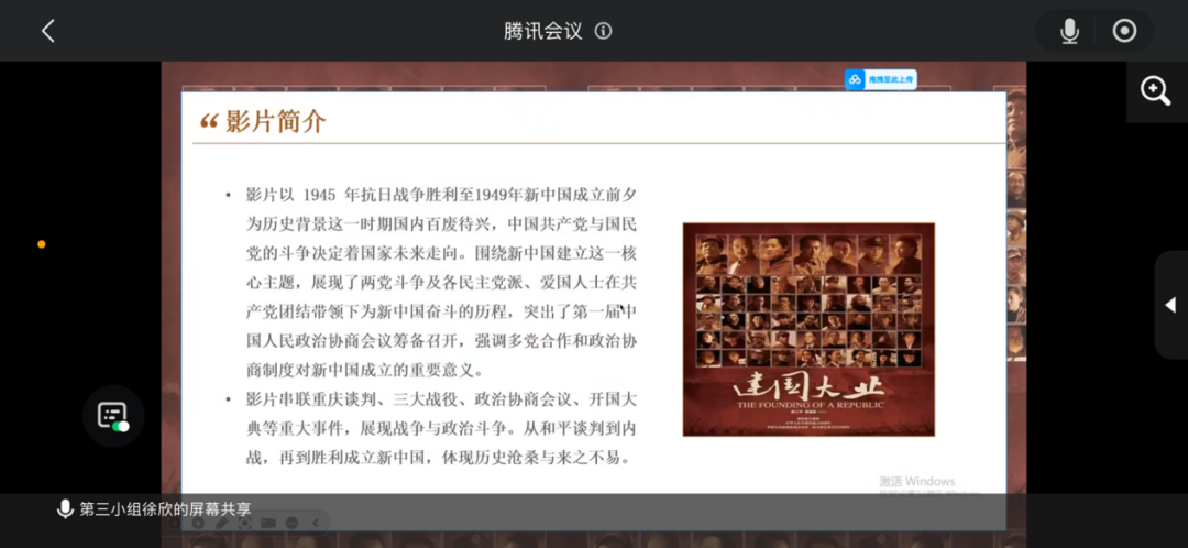徐欣同志给大家带来的影片《建国大业》。影片中,众多鲜活的人物形象跃然眼前。那些为了新中国的成立,不惜抛头颅、洒热血的革命先烈们,他们的英勇事迹和崇高精神,成为了推动历史前进的强大动力。如今,我们生活在一个和平、稳定的时代,国家日益繁荣昌盛,但我们不能忘记先辈们为了新中国的成立所付出的巨大牺牲。我们应当传承和弘扬他们的爱国精神,坚定理想信念,为实现中华民族的伟大复兴而努力奋斗。