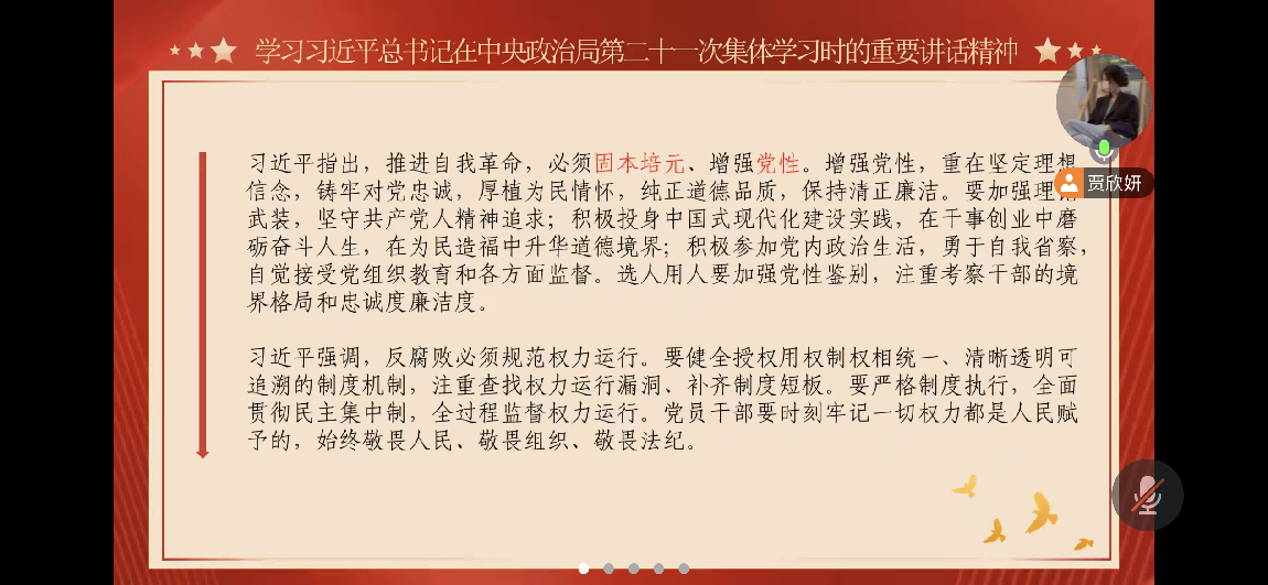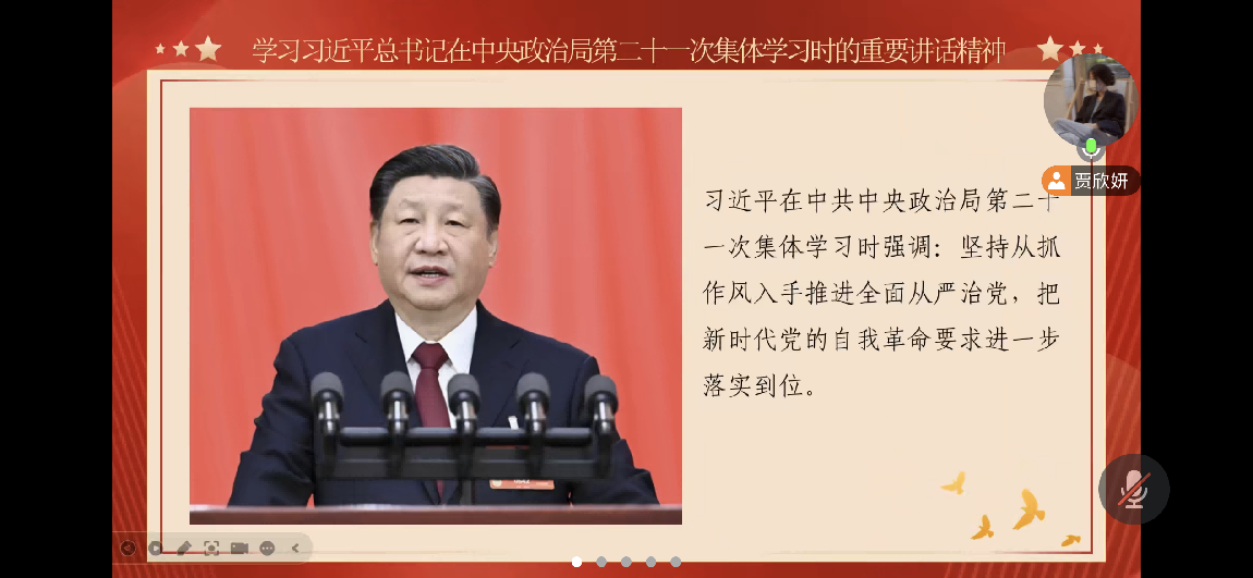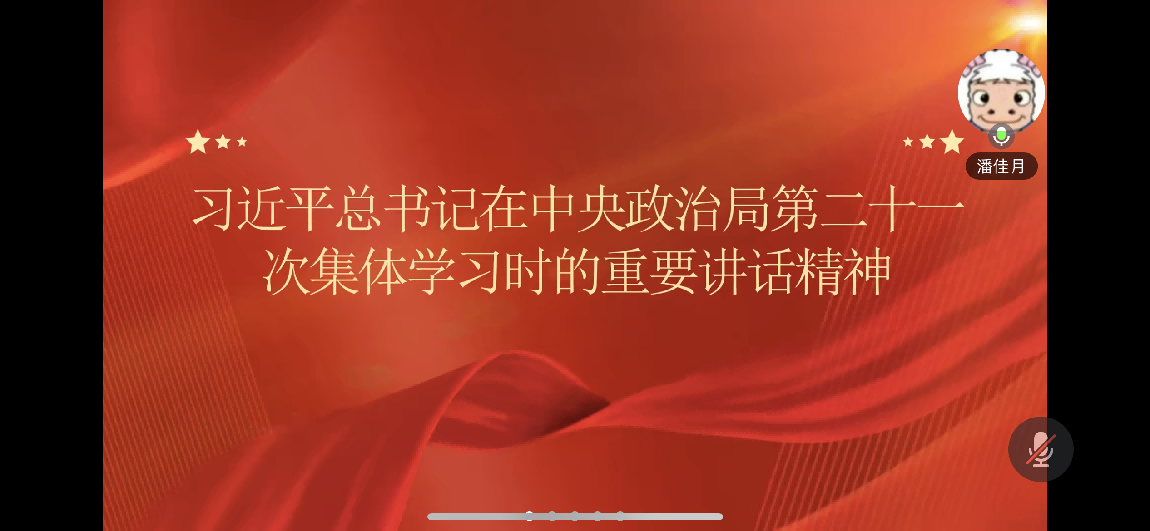 为深入学习贯彻习近平新时代中国特色社会主义思想,全面落实新时代党的建设总要求,2138cn太阳集团城学生党支部于2025年7月10日晚19时通过线上会议形式,组织开展了习近平总书记中央政治局第二十一次集体学习重要讲话精神专题学习会。本次学习采取"三会联动"形式,同步召开小组会、支部大会和支部委员会,实现理论学习全覆盖,确保重要讲话精神学深悟透、入脑入心。