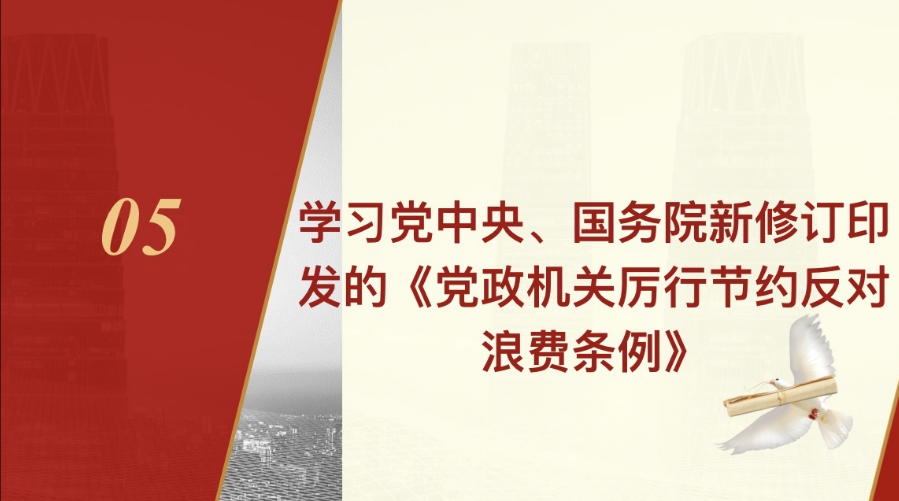 大会第五项学习党中央、国务院新修订印发的《党政机关厉行节约反对浪费条例》。会议指出,勤俭节约是中华民族的传统美德,也是我们党的传家宝。学生党员虽身处校园,也要牢固树立节约意识,从节约水电、珍惜粮食、合理消费等身边小事做起,坚决反对铺张浪费,为建设节约型校园贡献力量。