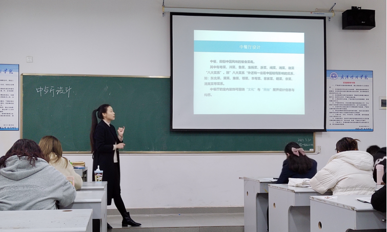 《商业空间设计(智能+)》属于环境艺术设计专业主干课程,需要学生已经具有相应的室内设计基础知识。本次公开课主要针对环境艺术设计专业202001班的课程进度,重点讲解了商业空间中中餐厅的设计方法。上课铃响后,章老师首先点评了上次课课程作业,通过随机提问的方式,让学生快速进入上课状态,在提问中引导学生相互发现问题并提出优化方案,以此来巩固上次课课程内容。在讲授新课环节,为同学们讲解了中餐厅的常用设计风格,中餐厅的主要功能分区以及设计要点,讲授条理清晰,重难点突出,富有启发性。为了让同学们更好的理解,章老师运用各种类型的设计图片,结合优秀案例分析,引导学生打开思路,理解中餐厅的设计方法。最后通过案例分析,与同学们一起梳理与总结了课程内容。