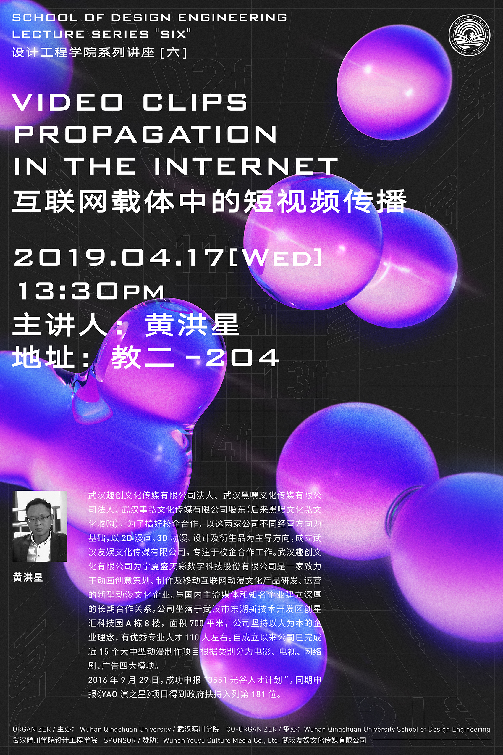 2019年4月17号,武汉趣创文化传媒有限公司黄洪星总经理应我校邀请,以师生参加创新创业大赛为契机,展开《互联网载体中的短视频传播》为题的演讲,我院数字媒体专业师生共同聆听。