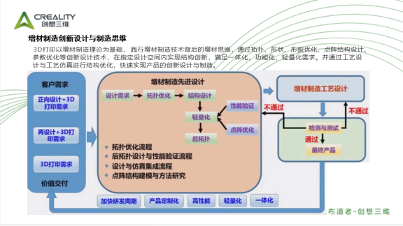 然后,徐江先生通过解析3D打印工艺全流程,剖析模型制作的两种模式(数字建模和三维扫描),通过模型切片将数字产品模型快速成型,成型后再对实物进行后期处理形成最终产品。3D打印以增材制造理论为基础,践行增材制造技术背后的增材思维,通过拓扑、形状、形貌优化、点阵结构设计、参数优化等创新设计技术,在指定设计空间内实现结构创新,满足一体化、功能化、轻量化需求。并通过工艺设计与工艺仿真进行结构优化,快速实现产品的创新设计与制造。