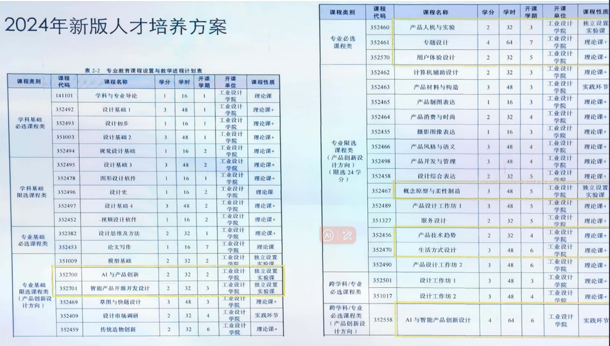 课程体系的优化:传统课程应当与数字化技术和智能化设计相结合,在大一大二前期引入如AI与产品创新、智能产品开源开发设计、产品人机与实验等新兴课程。同时,加强数据分析和人工智能的基本知识,让学生能够在实际设计过程中使用现代技术工具。