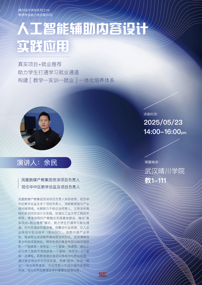 主讲人介绍:凤凰数媒产教集团资深项目负责人余民老师,现任华中区教学总监及多个项目负责人,深耕教育链与产业链对接领域。长期致力于校企协同育人,主导多所高校的实训项目设计与实施,如湖北工业大学工程技术学院、黄淮学院的产教融合实践基地建设,推动“真实项目+就业推荐”模式,助力学生打通学习就业通道。作为区域合作推进者,他整合行业资源,引入企业导师与前沿技术(如AIGC),创新共建产业学院、推进商业项目制作基地等合作形式,促进课程改革与科研成果转化,其中负责的黄淮学院动画学院获批一个国家级一流专业、一个省级一流课程,湖北工业大学工程技术学院获批一个省级一流专业、5个省级一流课程。其教育理念强调实践导向与职业衔接,通过跨区域协作与师资共享,构建“教学—实训—就业”一体化培养体系,为应用型人才成长提供系统性支持,成为应用型教育改革的重要实践推动者。