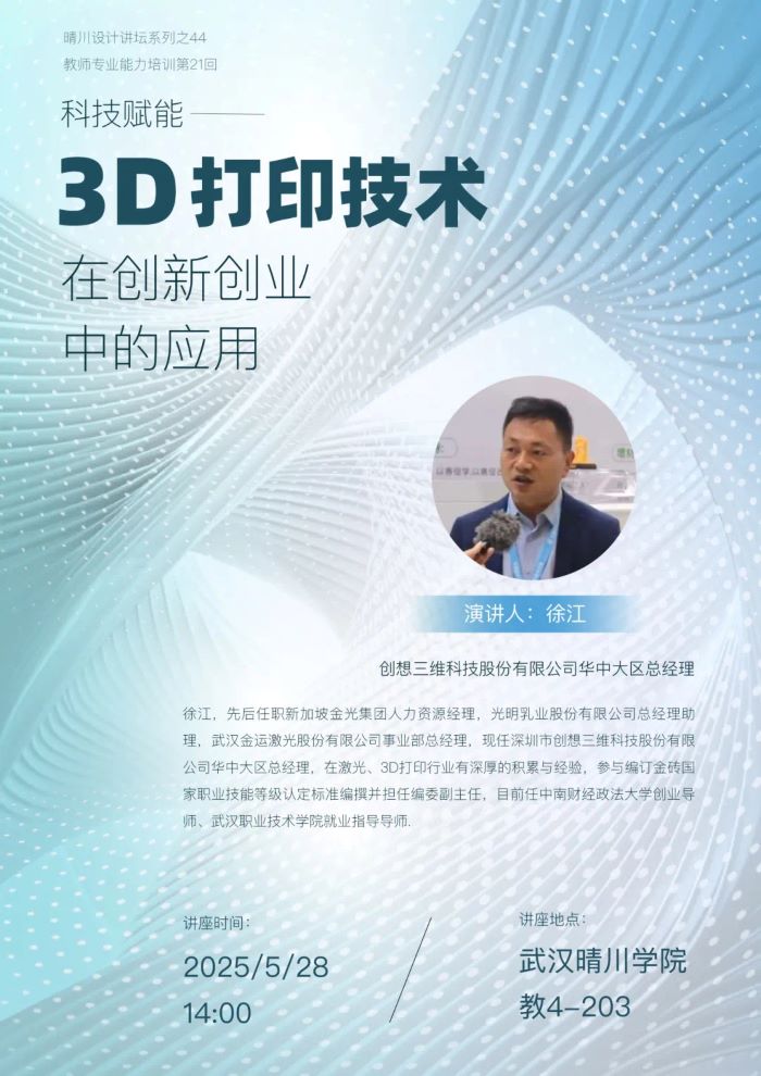 主讲人: 徐江主讲人身份:深圳市创想三维科技股份有限公司华中大区总经理中南财经政法大学创业导师武汉职业技术学院就业指导导师