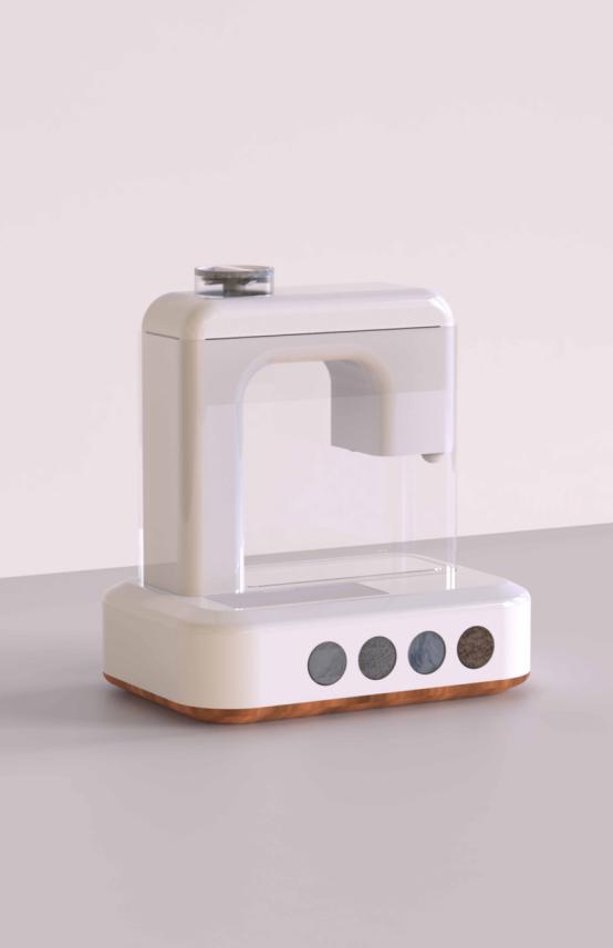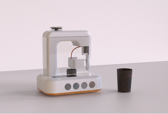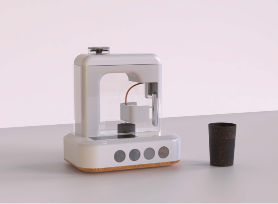 本次参赛作品《Re-Grounding: Used Coffee Grounds 3D Printer》,Re-Grounding是一款家用咖啡渣3D打印机,可以将用过的咖啡渣倒入到机器中。机器系统中提供了许多模型选项,用户可以从系统中进行选择。从顶部倒入用过的咖啡渣,然后单击屏幕,选择用户想要打印的3D模型。机器会将玉米淀粉、黄原胶、水和木屑等成分与咖啡渣彻底混合,成为3D打印的原材料。然后从喷嘴输出材料并开始3D打印。咖啡渣3D打印机器不仅满足了用户对新工具和创意模型的需求,还结合了环境保护的概念。它为用户提供了一种有趣、方便和智能的方式来参与环境保护。