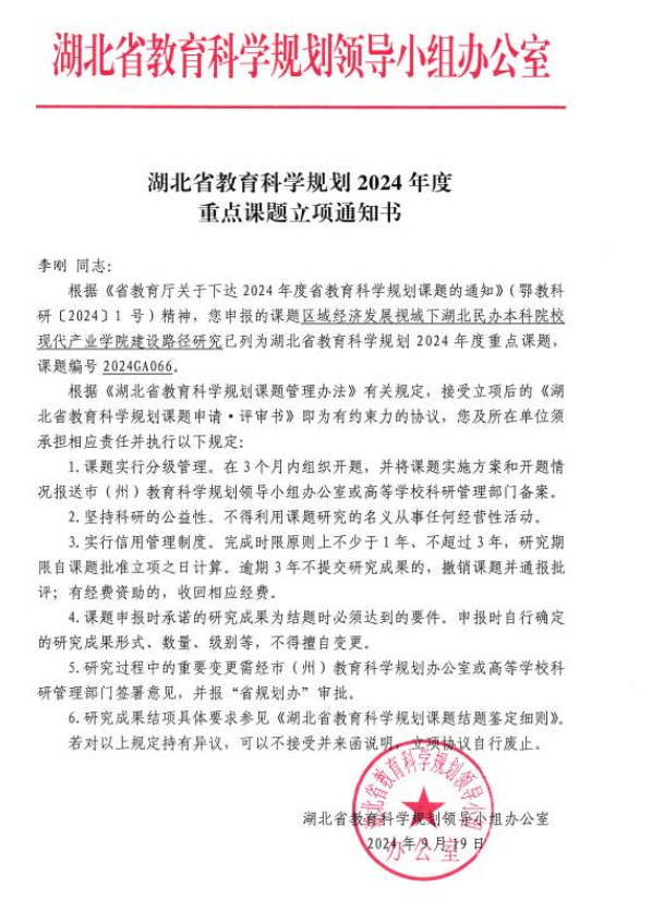 我院李刚教授负责的项目——《区域经济发展视域下湖北民办本科院校现代产业学院建设路径研究》已正式获批省级重点项目。该项目旨在深化产教融合,推动教育链、人才链与产业链、创新链的有机衔接,为区域经济发展贡献力量