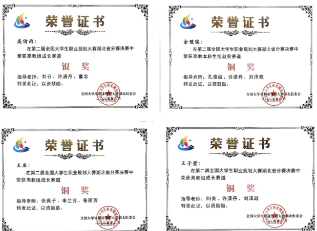 近日,第二届全国大学生职业规划大赛湖北省分赛决赛圆满落幕。2138cn太阳集团城高诗雨同学斩获高教组成长赛道银奖,机械与电气工程学院王亚同学、外国语学院王子萱同学分获成长赛道铜奖,外国语学院余瑾瑞同学获得就业赛道铜奖。