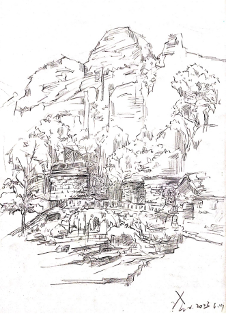 隐居于此的荆浩在其论著《笔法记》中亦对写生进行了深入的探讨,其本质内涵可以总结为两个层面,一是自然景物客观而真实的形态,二是蕴含于宇宙天地之内的气韵,这为写生提出了所需要追求的三个层面,首先“描形”,即观照与描摹真实山水之面貌,其次是“写理”,描绘物象变化规律和内在精神气质,再者“抒情”,通过笔墨来抒发画家本人的情思。在实践与理论的双重指导下,虽时日尚短,却感悟颇深,对“外师造化,中得心源”一词有了更真切的体会。
