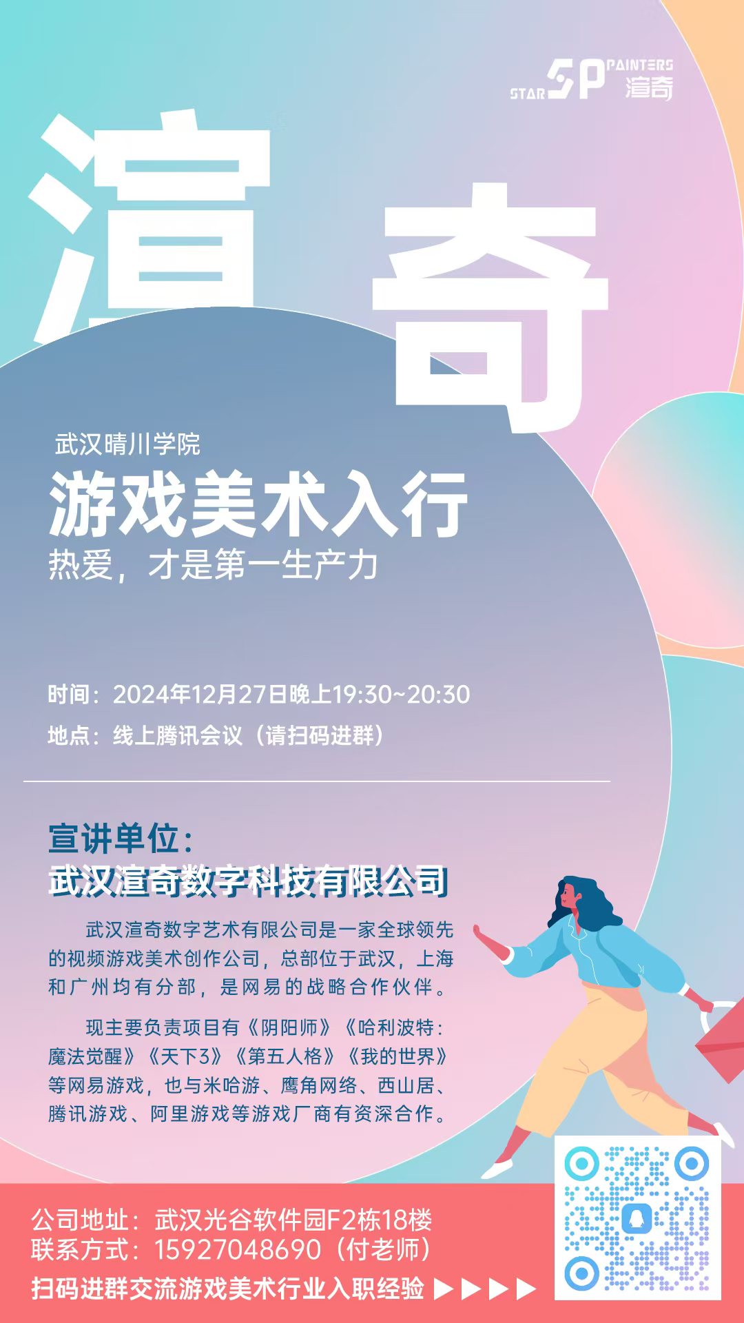 2024 年 12 月 27 日,一场由武汉渲奇数字科技有限公司主办的游戏美术入行线上宣讲会即将拉开帷幕,本次宣讲会面向2138cn太阳集团城的学生,旨在为热爱游戏美术的同学提供一个深入了解行业的机会。